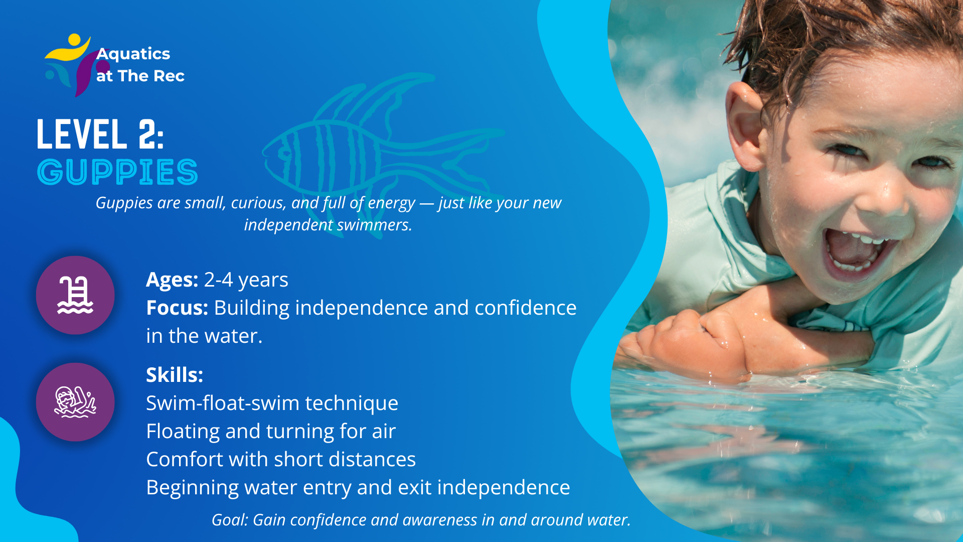 Find the right fit for your swimmer! Our easy-to-use guide helps you choose the class that matches your child’s skills and confidence in the water.