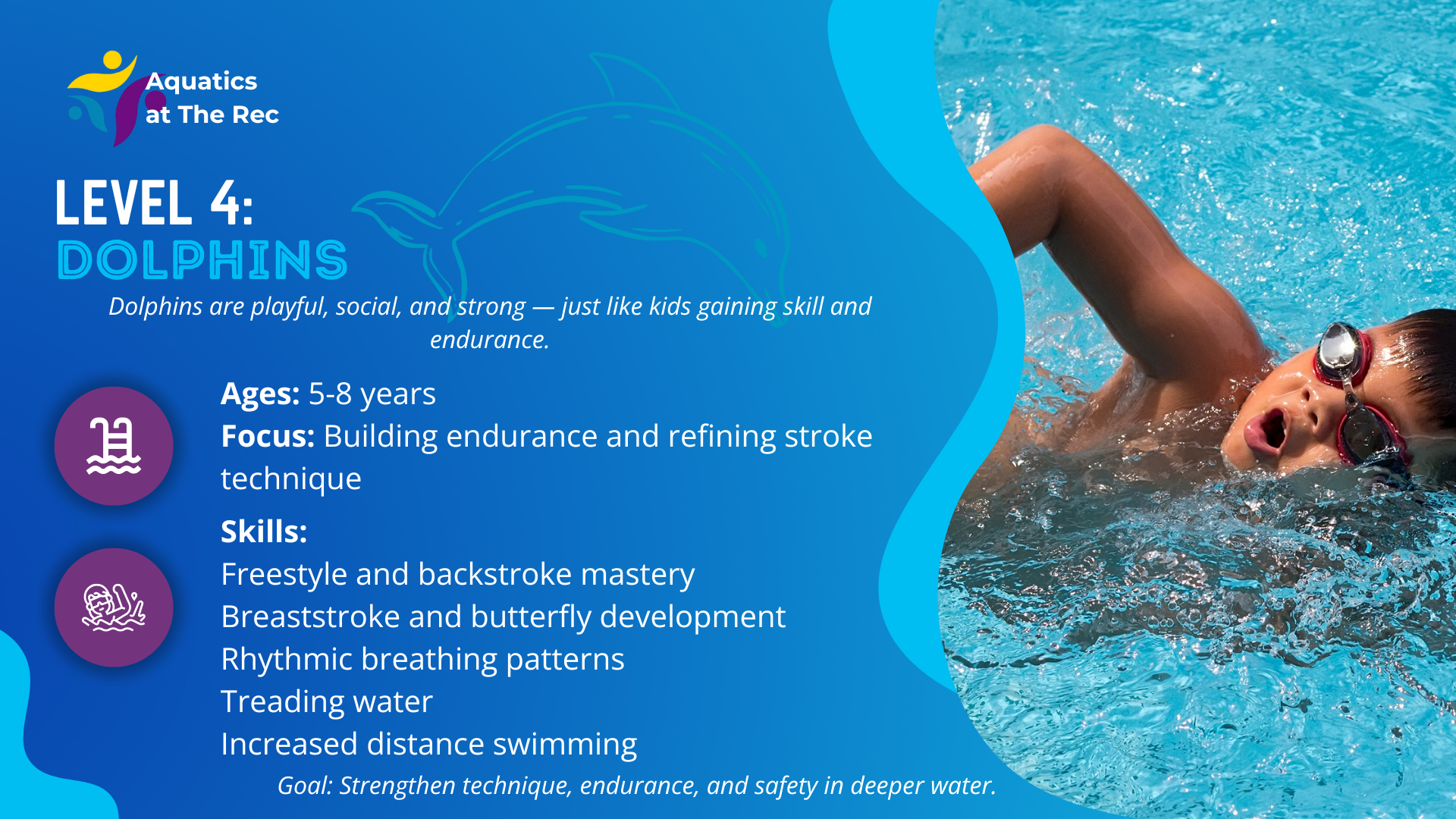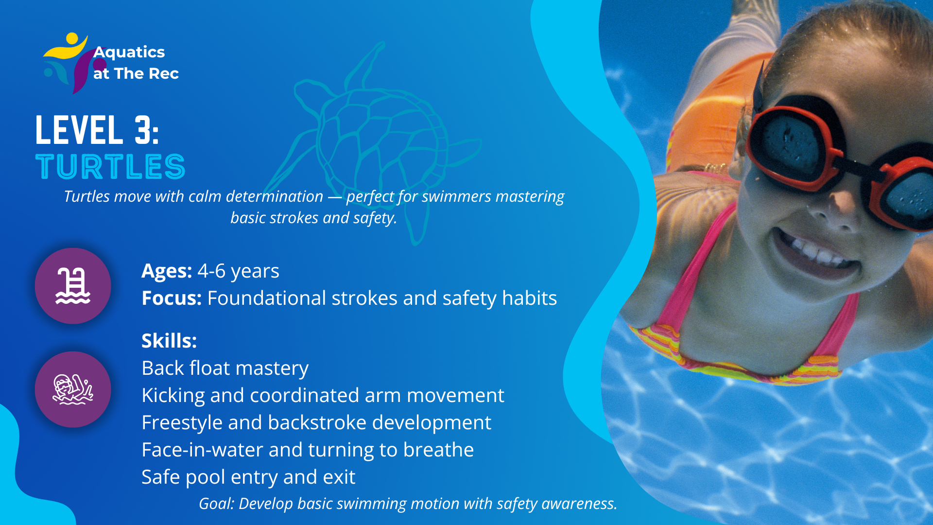 FAQsOur program is designed around the foundations of water safety and principles of survival swim – skills that teach children to be safe, stay calm, and, if needed, self-rescue in the water. From there, we build age-appropriate and ability-based levels that focus on strong technique, endurance, and foster a lifelong love for swimming.